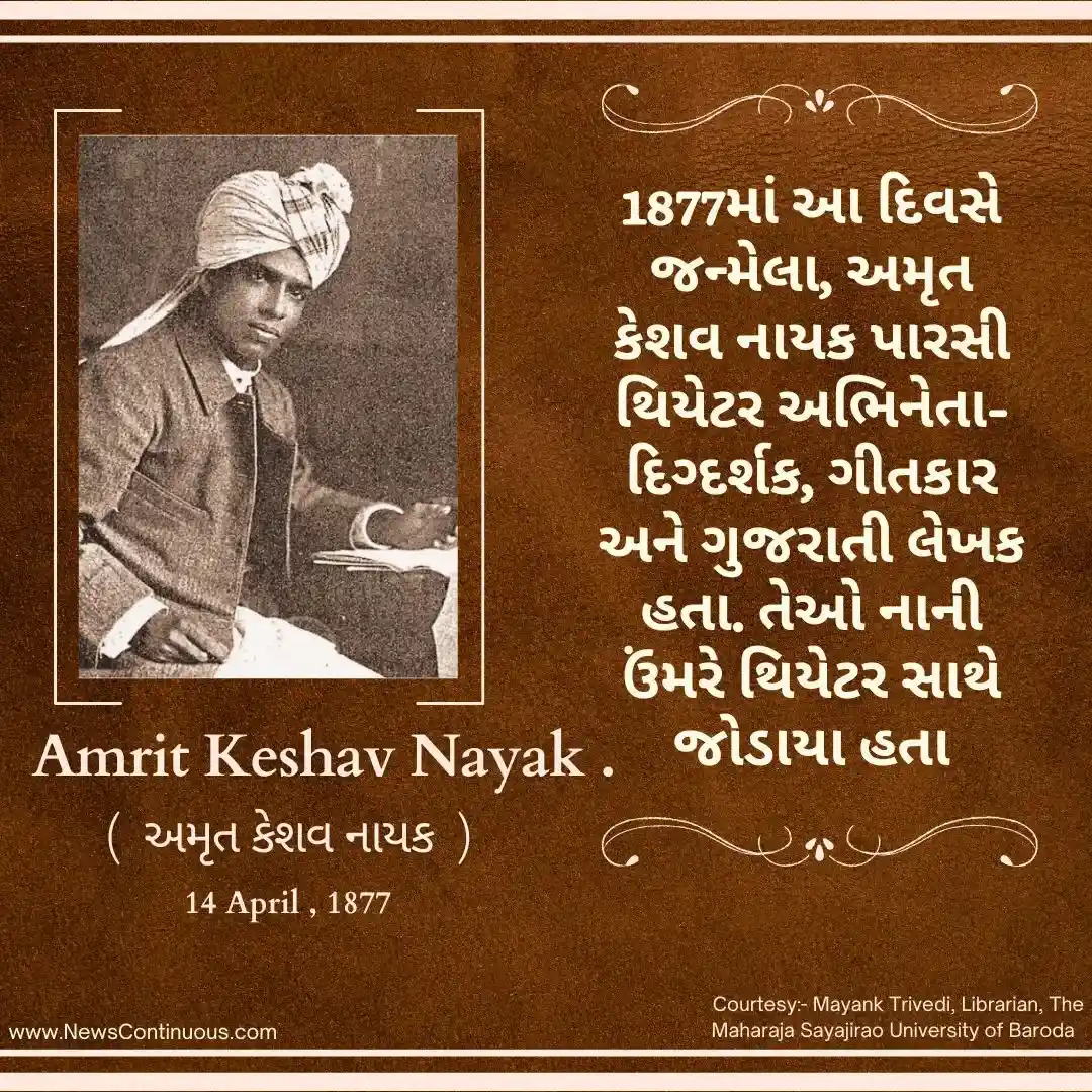 Amrit Keshav Nayak : 1877માં આ દિવસે જન્મેલા, અમૃત કેશવ નાયક પારસી ( Theater actor ) થિયેટર અભિનેતા-દિગ્દર્શક, ગીતકાર અને ગુજરાતી લેખક હતા. તેઓ નાની ઉંમરે થિયેટર સાથે જોડાયા હતા અને બાદમાં શેક્સપિયરના નાટકોના રૂપાંતરણો સહિત અનેક નાટકોનું દિગ્દર્શન કર્યું હતું. તેમણે નાટકો અને નવલકથાઓ પણ લખી.