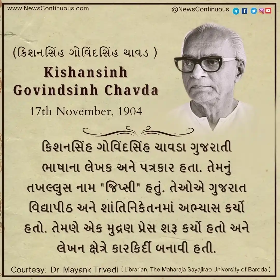 Kishansinh Govindsinh Chavda : 1904 માં આ દિવસે જન્મેલા, કિશનસિંહ ગોવિંદસિંહ ચાવડા ગુજરાતી ભાષાના લેખક ( Gujarati writer ) અને પત્રકાર હતા. તેમનું તખલ્લુસ નામ “જિપ્સી” હતું. તેઓએ ગુજરાત વિદ્યાપીઠ ( Gujarat Vidyapith ) અને શાંતિનિકેતનમાં અભ્યાસ કર્યો હતો. તેમણે એક મુદ્રણ પ્રેસ શરૂ કર્યો હતો અને લેખન ક્ષેત્રે કારકિર્દી બનાવી હતી. તેમને તેમના પુસ્તક અમાસના તારા માટે 1950માં નર્મદ સુવર્ણચંદ્રક મળ્યો હતો.