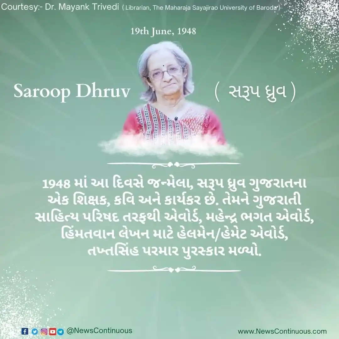 Saroop Dhruv: 1948 માં આ દિવસે જન્મેલા, સરૂપ ધ્રુવ ગુજરાતના એક શિક્ષક( Gujarat Teacher ) , કવિ અને કાર્યકર છે. તેમને ગુજરાતી સાહિત્ય ( Gujarati Sahitya ) પરિષદ તરફથી એવોર્ડ, મહેન્દ્ર ભગત એવોર્ડ, હિંમતવાન લેખન માટે હેલમેન/હેમેટ એવોર્ડ, તખ્તસિંહ પરમાર પુરસ્કાર મળ્યો.
