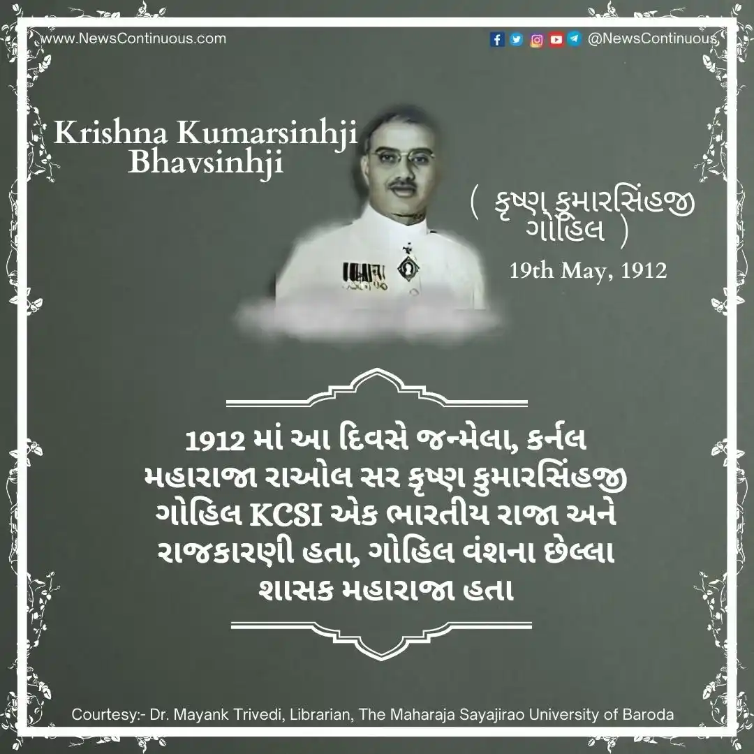 Krishna Kumarsinhji Bhavsinhji: 1912 માં આ દિવસે જન્મેલા, કર્નલ મહારાજા રાઓલ સર કૃષ્ણ કુમારસિંહજી ગોહિલ KCSI એક ભારતીય રાજા અને રાજકારણી ( politician ) હતા, ગોહિલ વંશના છેલ્લા શાસક મહારાજા હતા, જેમણે 1919 થી 1948 સુધી ભાવનગર ( Bhavnagar ) રાજ્ય પર શાસન કર્યું અને 1948 થી 1952 સુધી મદ્રાસના પ્રથમ ભારતીય ગવર્નર તરીકે પણ સેવા આપી