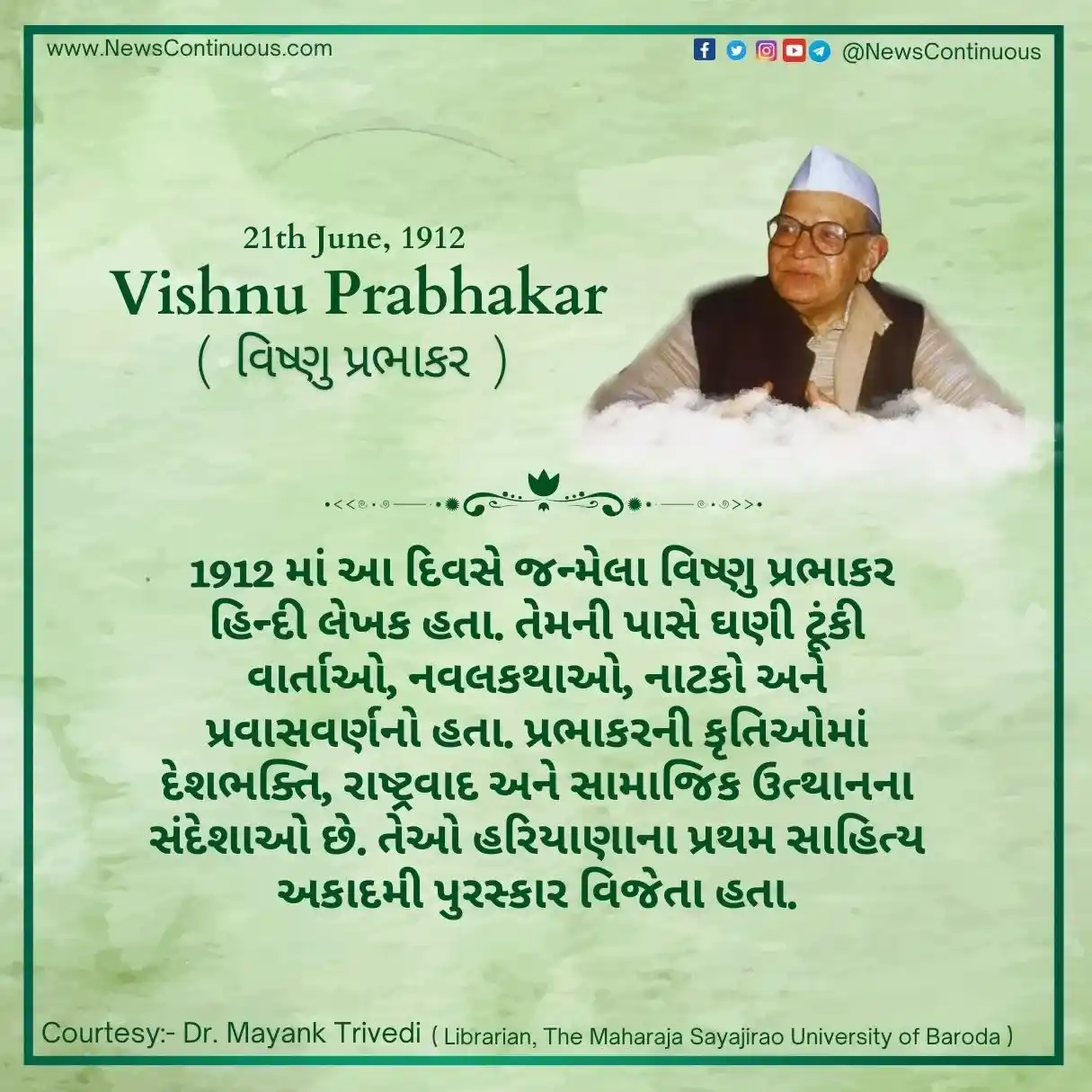 Vishnu Prabhakar : 1912 માં આ દિવસે જન્મેલા વિષ્ણુ પ્રભાકર હિન્દી લેખક ( Hindi writer ) હતા. તેમની પાસે ઘણી ટૂંકી વાર્તાઓ, નવલકથાઓ, નાટકો અને પ્રવાસવર્ણનો હતા. પ્રભાકરની કૃતિઓમાં દેશભક્તિ, રાષ્ટ્રવાદ અને સામાજિક ઉત્થાનના સંદેશાઓ છે. તેઓ હરિયાણાના પ્રથમ સાહિત્ય અકાદમી પુરસ્કાર વિજેતા હતા. તેમને 1993માં સાહિત્ય અકાદમી પુરસ્કાર, 1995માં મહાપંડિત રાહુલ સાંકૃત્યયન પુરસ્કાર અને 2004માં ભારત સરકાર દ્વારા પદ્મ ભૂષણથી નવાજવામાં આવ્યા હતા.