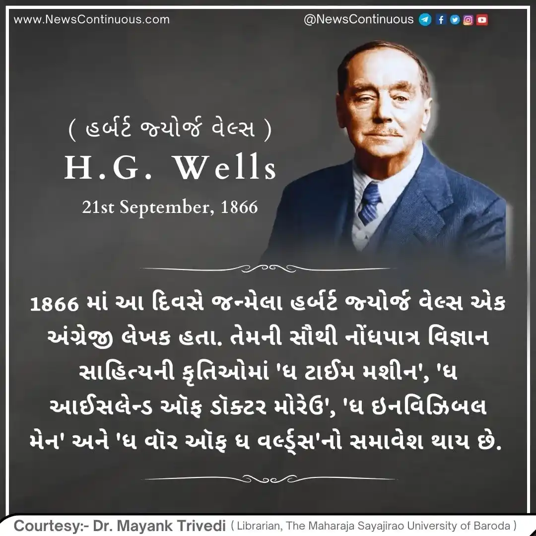 H.G. Wells: 1866 માં આ દિવસે જન્મેલા હર્બર્ટ જ્યોર્જ વેલ્સ એક અંગ્રેજી લેખક ( English writer ) હતા. તેમની સૌથી નોંધપાત્ર વિજ્ઞાન સાહિત્યની કૃતિઓમાં ‘ધ ટાઈમ મશીન’, ‘ધ આઈસલેન્ડ ઑફ ડૉક્ટર મોરેઉ’, ‘ધ ઇનવિઝિબલ મેન’ અને ‘ધ વૉર ઑફ ધ વર્લ્ડ્સ’નો સમાવેશ થાય છે. ધ ટાઈમ મશીનનો ( The Time Machine ) સમાવેશ વિશ્વની સર્વોત્તમ વિજ્ઞાાન કથા (સાયન્સ ફિક્શન)માં થાય છે, તો વળી એચ.જી.વેલ્સ જુલ્સ વર્ન પછી બીજા સર્વોત્તમ વિજ્ઞાાન કથા લેખક પણ ગણાય છે.