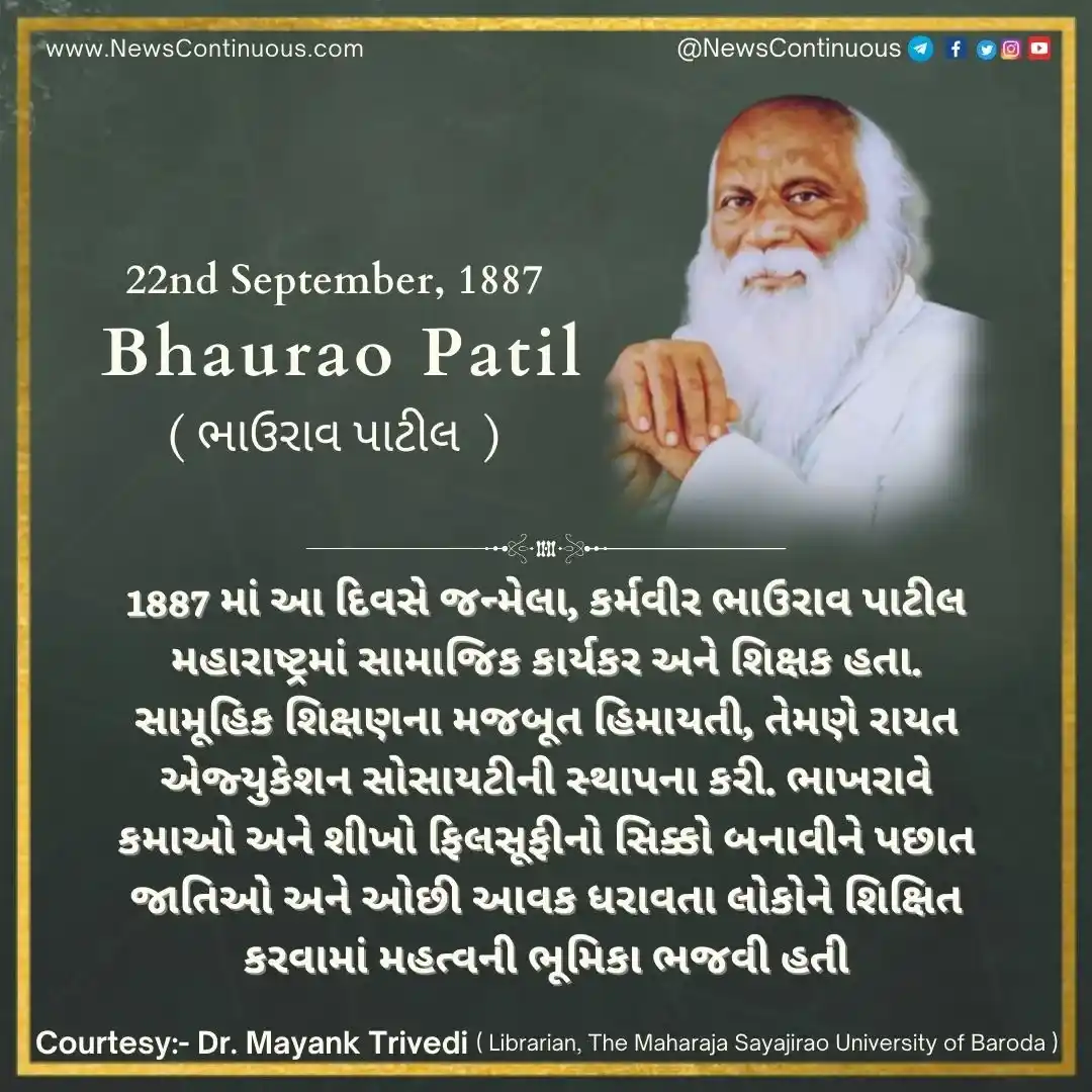 Bhaurao Patil : 1887 માં આ દિવસે જન્મેલા, કર્મવીર ભાઉરાવ પાટીલ મહારાષ્ટ્રમાં સામાજિક કાર્યકર ( Social worker ) અને શિક્ષક હતા. સામૂહિક શિક્ષણના મજબૂત હિમાયતી, તેમણે રાયત એજ્યુકેશન ( Rayat Shikshan Sanstha ) સોસાયટીની સ્થાપના કરી. ભાખરાવે કમાઓ અને શીખો ફિલસૂફીનો સિક્કો બનાવીને પછાત જાતિઓ અને ઓછી આવક ધરાવતા લોકોને શિક્ષિત કરવામાં મહત્વની ભૂમિકા ભજવી હતી. તેઓ મહાત્મા જ્યોતિરાવ ફુલે દ્વારા સ્થાપિત સત્યશોધક સમાજના અગ્રણી સભ્ય હતા. ભારત સરકારે તેમને 1959માં ભારતમાં પદ્મ ભૂષણથી નવાજ્યા હતા.