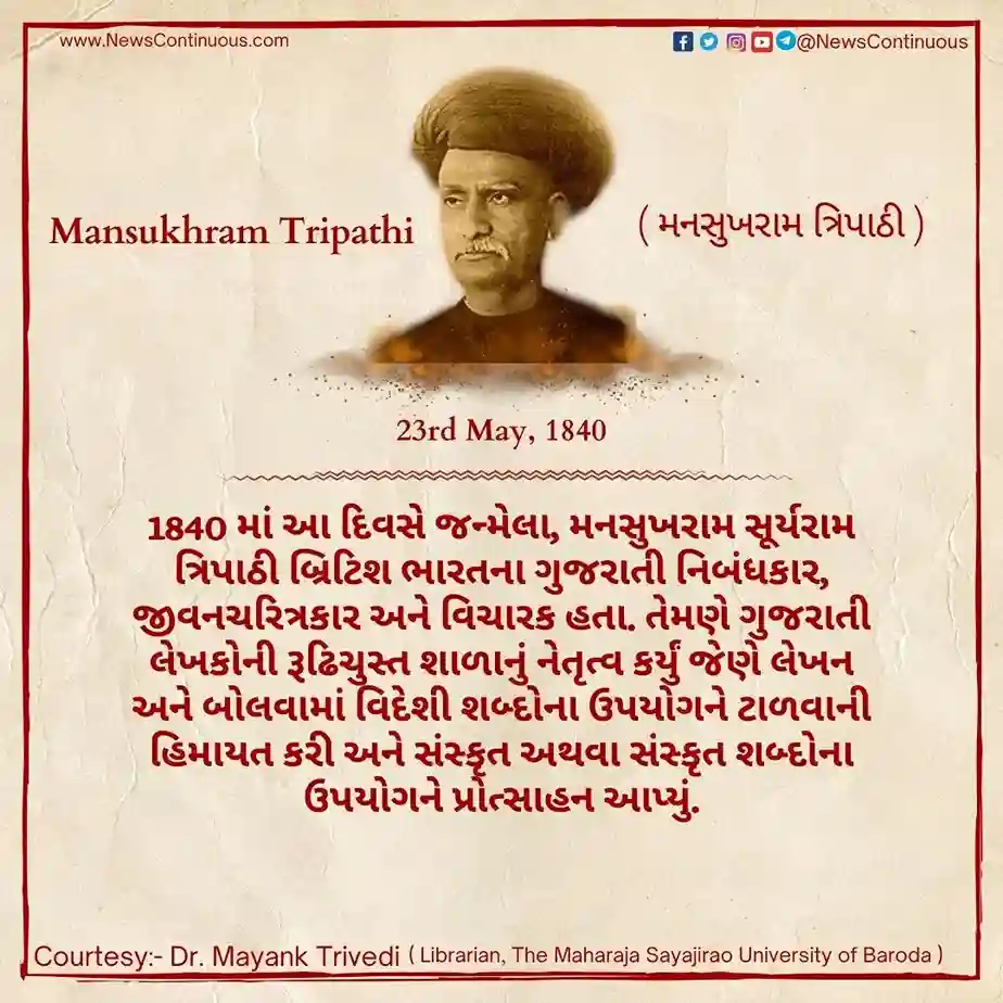 Mansukhram Tripathi: 1840 માં આ દિવસે જન્મેલા, મનસુખરામ સૂર્યરામ ત્રિપાઠી બ્રિટિશ ભારતના ગુજરાતી નિબંધકાર ( Gujarati essayist ) , જીવનચરિત્રકાર અને વિચારક હતા. તેમણે ગુજરાતી લેખકોની ( Gujarati writer ) રૂઢિચુસ્ત શાળાનું નેતૃત્વ કર્યું જેણે લેખન અને બોલવામાં વિદેશી શબ્દોના ઉપયોગને ટાળવાની હિમાયત કરી અને સંસ્કૃત અથવા સંસ્કૃત શબ્દોના ઉપયોગને પ્રોત્સાહન આપ્યું.