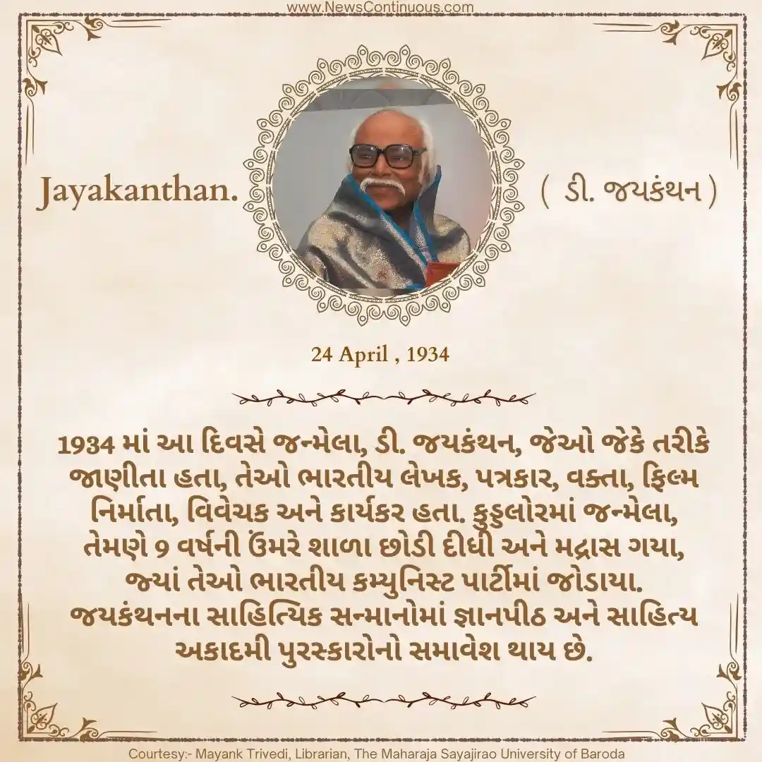 Jayakanthan : 1934 માં આ દિવસે જન્મેલા, ડી. જયકંથન, જેઓ જેકે તરીકે જાણીતા હતા, તેઓ ભારતીય લેખક ( Indian writer ) , પત્રકાર, વક્તા, ફિલ્મ નિર્માતા, વિવેચક અને કાર્યકર હતા. કુડ્ડલોરમાં જન્મેલા, તેમણે 9 વર્ષની ઉંમરે શાળા છોડી દીધી અને મદ્રાસ ગયા, જ્યાં તેઓ ભારતીય કમ્યુનિસ્ટ પાર્ટીમાં ( Communist Party of India ) જોડાયા. જયકંથનના સાહિત્યિક સન્માનોમાં જ્ઞાનપીઠ અને સાહિત્ય અકાદમી પુરસ્કારોનો સમાવેશ થાય છે. તેઓ પદ્મ ભૂષણ, ભારતના ત્રીજા સર્વોચ્ચ નાગરિક સન્માન, સોવિયેત લેન્ડ નેહરુ એવોર્ડ અને રશિયન સરકારના ઓર્ડર ઓફ ફ્રેન્ડશીપના પણ પ્રાપ્તકર્તા હતા