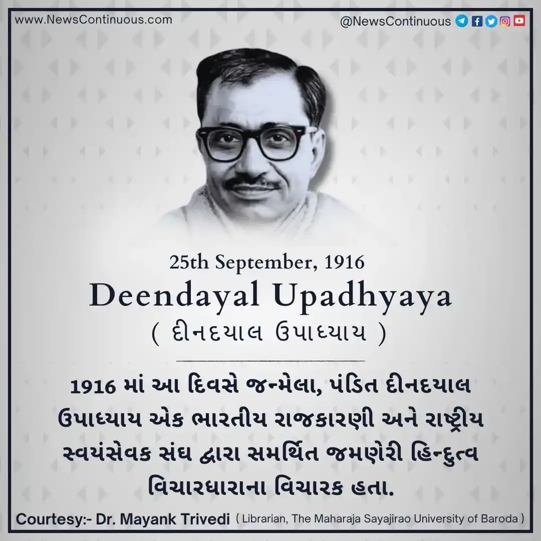 Deendayal Upadhyaya : 1916 માં આ દિવસે જન્મેલા, પંડિત દીનદયાલ ઉપાધ્યાય એક ભારતીય રાજકારણી ( Indian politician ) અને રાષ્ટ્રીય સ્વયંસેવક સંઘ દ્વારા સમર્થિત જમણેરી હિન્દુત્વ વિચારધારાના વિચારક હતા. ભારતીય જનતા પાર્ટીના અગ્રદૂત, રાજકીય પક્ષ ભારતીય રાષ્ટ્રીય કોંગ્રેસના નેતા હતા. પરંપરાગત ભારતીય ધોતી-કુર્તા અને ટોપી પહેરીને સિવિલ સર્વિસ પરીક્ષા હોલમાં હાજર રહેવા માટે તેઓ પંડિતજી તરીકે પણ જાણીતા હતા.