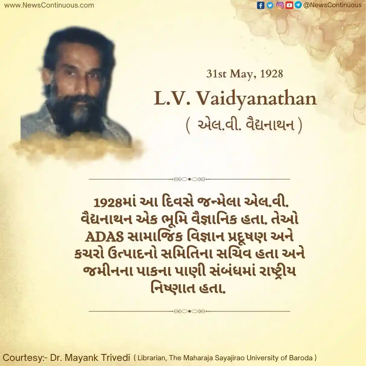 L.V. Vaidyanathan : 1928માં આ દિવસે જન્મેલા એલ.વી. વૈદ્યનાથન એક ભૂમિ વૈજ્ઞાનિક ( Soil scientist ) હતા. તેઓ ADAS સામાજિક વિજ્ઞાન પ્રદૂષણ અને કચરો ઉત્પાદનો સમિતિના સચિવ હતા અને જમીનના પાકના પાણી સંબંધમાં રાષ્ટ્રીય નિષ્ણાત હતા. તેઓ જૈવિક અને રાસાયણિક વિજ્ઞાન વિભાગ, એસેક્સ યુનિવર્સિટીમાં અને બર્મિંગહામ યુનિવર્સિટીની રસાયણશાસ્ત્રની શાળાના સોઇલ કોલોઇડ્સ ગ્રૂપના રસાયણશાસ્ત્રમાં મુલાકાતી પ્રોફેસર હતા. ADAS માંથી નિવૃત્તિ પછી, તેમણે બર્મિંગહામ યુનિવર્સિટીમાં ( Birmingham University ) માનદ સંશોધન પ્રોફેસર તરીકે સેવા આપી હતી જ્યાં 13 નવેમ્બર 2000ના રોજ તેમનું અવસાન થયું હતું.