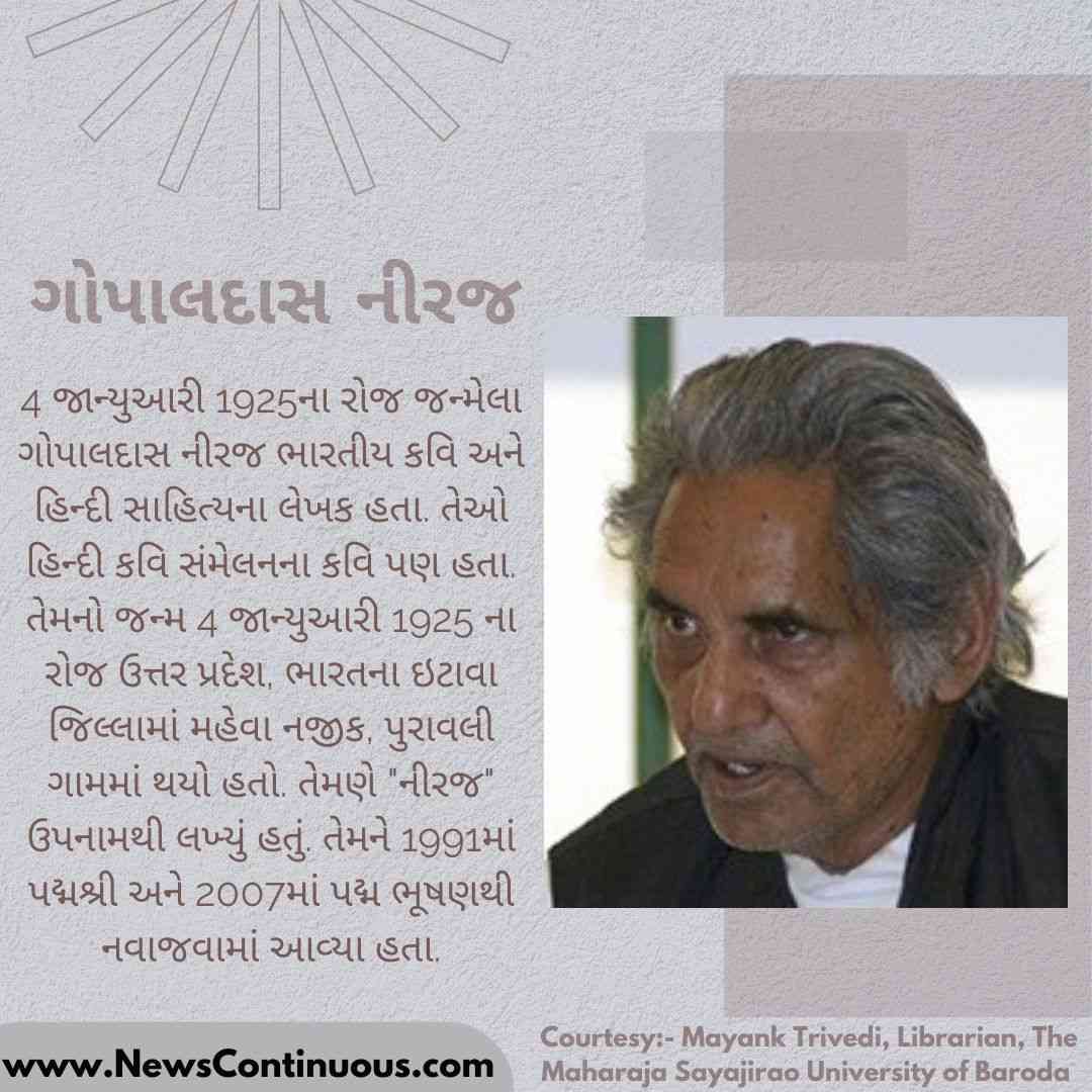 Gopaldas Neeraj: 4 જાન્યુઆરી 1925ના રોજ જન્મેલા ગોપાલદાસ નીરજ ભારતીય કવિ અને હિન્દી સાહિત્યના લેખક હતા. તેઓ હિન્દી કવિ સંમેલનના કવિ પણ હતા. તેમનો જન્મ 4 જાન્યુઆરી 1925 ના રોજ ઉત્તર પ્રદેશ, ભારતના ઇટાવા જિલ્લામાં મહેવા નજીક, પુરાવલી ગામમાં થયો હતો. તેમણે “નીરજ” ઉપનામથી લખ્યું હતું. તેમને 1991માં પદ્મશ્રી અને 2007માં પદ્મ ભૂષણથી નવાજવામાં આવ્યા હતા.