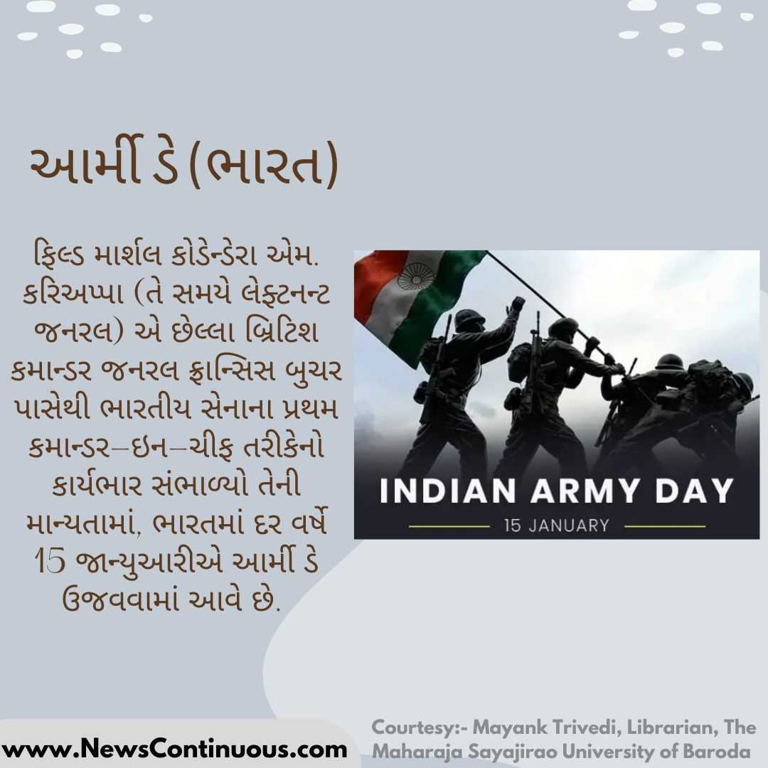 Indian Army Day: ફિલ્ડ માર્શલ કોડેન્ડેરા એમ. કરિઅપ્પા (તે સમયે લેફ્ટનન્ટ જનરલ) એ છેલ્લા બ્રિટિશ કમાન્ડર જનરલ ફ્રાન્સિસ બુચર પાસેથી ભારતીય સેનાના પ્રથમ કમાન્ડર-ઇન-ચીફ તરીકેનો કાર્યભાર સંભાળ્યો તેની માન્યતામાં, ભારતમાં દર વર્ષે 15 જાન્યુઆરીએ આર્મી ડે ઉજવવામાં આવે છે.