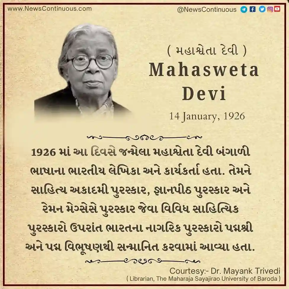 Mahasweta Devi : 1926 માં આ દિવસે જન્મેલા મહાશ્વેતા દેવી બંગાળી ભાષાના ભારતીય લેખિકા અને કાર્યકર્તા હતા. તેમની નોંધપાત્ર સાહિત્યિક કૃતિઓમાં હાજર ચુરાશીર મા, રૂદાલી અને અરન્યેર અધિકારનો સમાવેશ થાય છે. તેમને સાહિત્ય અકાદમી પુરસ્કાર, જ્ઞાનપીઠ પુરસ્કાર અને રેમન મેગ્સેસે પુરસ્કાર જેવા વિવિધ સાહિત્યિક પુરસ્કારો ઉપરાંત ભારતના નાગરિક પુરસ્કારો પદ્મશ્રી અને પદ્મ વિભૂષણથી સન્માનિત કરવામાં આવ્યા હતા.