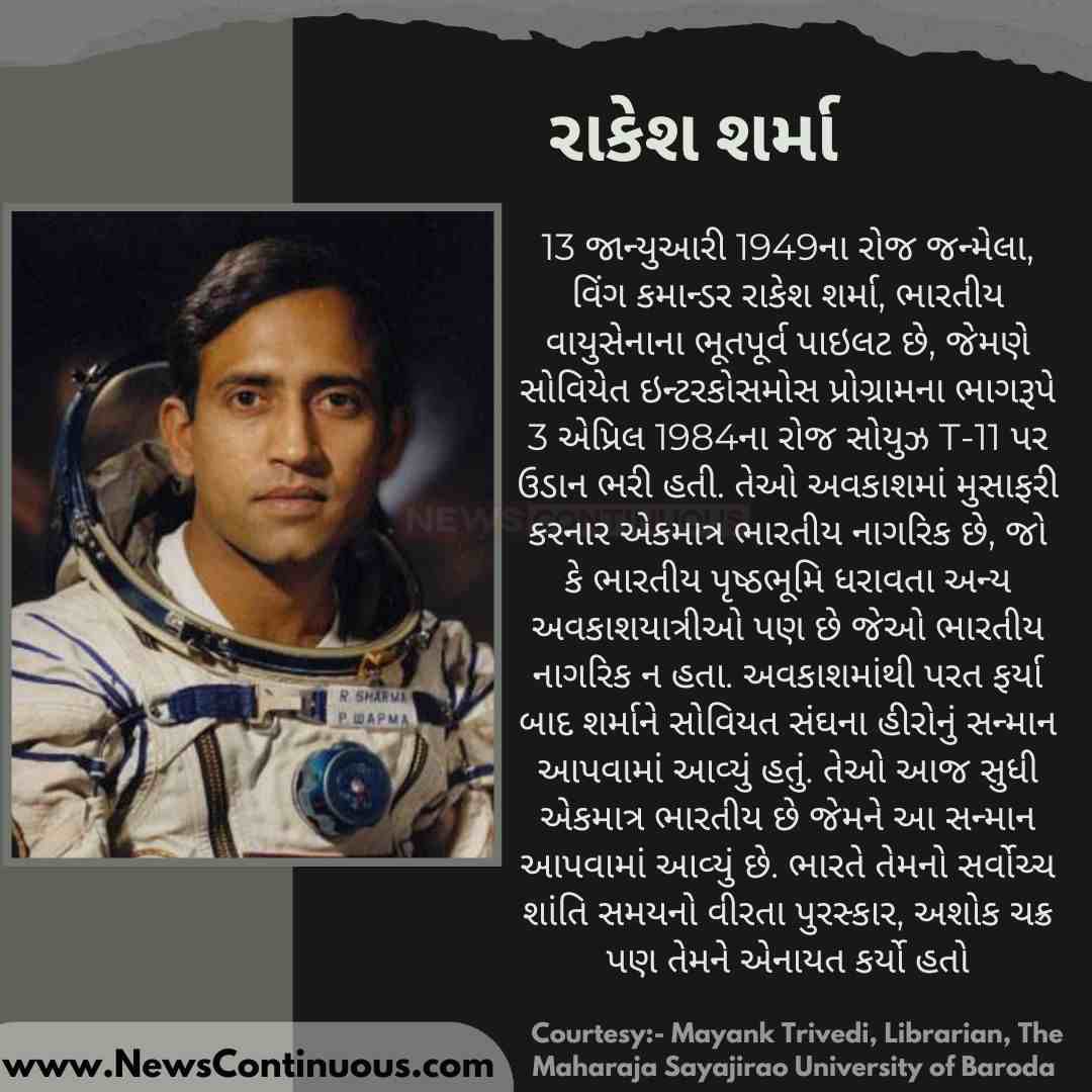 Rakesh Sharma: 13 જાન્યુઆરી 1949ના રોજ જન્મેલા, વિંગ કમાન્ડર રાકેશ શર્મા, ભારતીય વાયુસેનાના ભૂતપૂર્વ પાઇલટ છે, જેમણે સોવિયેત ઇન્ટરકોસમોસ પ્રોગ્રામના ભાગરૂપે 3 એપ્રિલ 1984ના રોજ સોયુઝ T-11 પર ઉડાન ભરી હતી. તેઓ અવકાશમાં મુસાફરી કરનાર એકમાત્ર ભારતીય નાગરિક છે, જો કે ભારતીય પૃષ્ઠભૂમિ ધરાવતા અન્ય અવકાશયાત્રીઓ પણ છે જેઓ ભારતીય નાગરિક ન હતા. અવકાશમાંથી પરત ફર્યા બાદ શર્માને સોવિયત સંઘના હીરોનું સન્માન આપવામાં આવ્યું હતું. તેઓ આજ સુધી એકમાત્ર ભારતીય છે જેમને આ સન્માન આપવામાં આવ્યું છે. ભારતે તેમનો સર્વોચ્ચ શાંતિ સમયનો વીરતા પુરસ્કાર, અશોક ચક્ર પણ તેમને એનાયત કર્યો હતો.