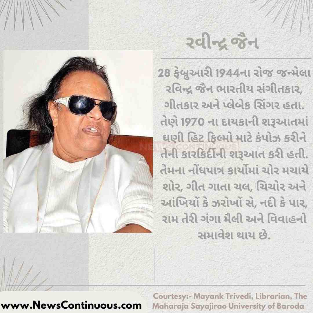 Ravindra Jain: 28 ફેબ્રુઆરી 1944ના રોજ જન્મેલા રવિન્દ્ર જૈન ભારતીય સંગીતકાર, ગીતકાર અને પ્લેબેક સિંગર હતા. તેણે 1970 ના દાયકાની શરૂઆતમાં ઘણી હિટ ફિલ્મો માટે કંપોઝ કરીને તેની કારકિર્દીની શરૂઆત કરી હતી. તેમના નોંધપાત્ર કાર્યોમાં ચોર મચાયે શોર, ગીત ગાતા ચલ, ચિચોર અને આંખિયોં કે ઝરોખોં સે, નદી કે પાર, રામ તેરી ગંગા મૈલી અને વિવાહનો સમાવેશ થાય છે.