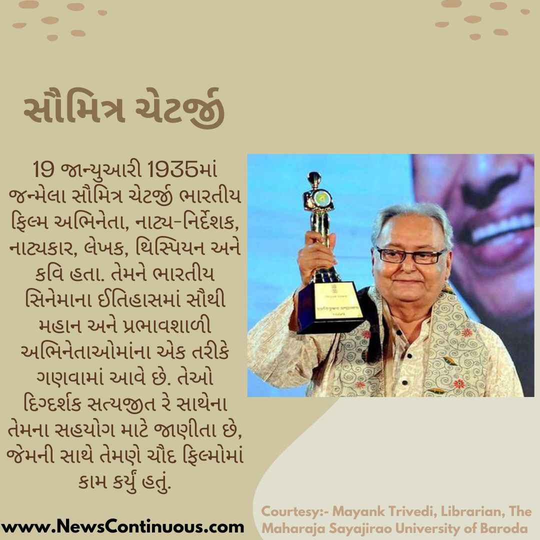Soumitra Chatterjee: 19 જાન્યુઆરી 1935માં જન્મેલા સૌમિત્ર ચેટર્જી ભારતીય ફિલ્મ અભિનેતા, નાટ્ય-નિર્દેશક, નાટ્યકાર, લેખક, થિસ્પિયન અને કવિ હતા. તેમને ભારતીય સિનેમાના ઈતિહાસમાં સૌથી મહાન અને પ્રભાવશાળી અભિનેતાઓમાંના એક તરીકે ગણવામાં આવે છે. તેઓ દિગ્દર્શક સત્યજીત રે સાથેના તેમના સહયોગ માટે જાણીતા છે, જેમની સાથે તેમણે ચૌદ ફિલ્મોમાં કામ કર્યું હતું.