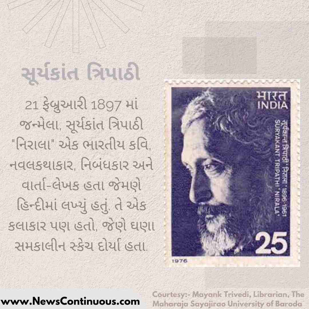 Suryakant Tripathi: 21 ફેબ્રુઆરી 1897 માં જન્મેલા, સૂર્યકાંત ત્રિપાઠી “નિરાલા” એક ભારતીય કવિ, નવલકથાકાર, નિબંધકાર અને વાર્તા-લેખક હતા જેમણે હિન્દીમાં લખ્યું હતું. તે એક કલાકાર પણ હતો, જેણે ઘણા સમકાલીન સ્કેચ દોર્યા હતા.