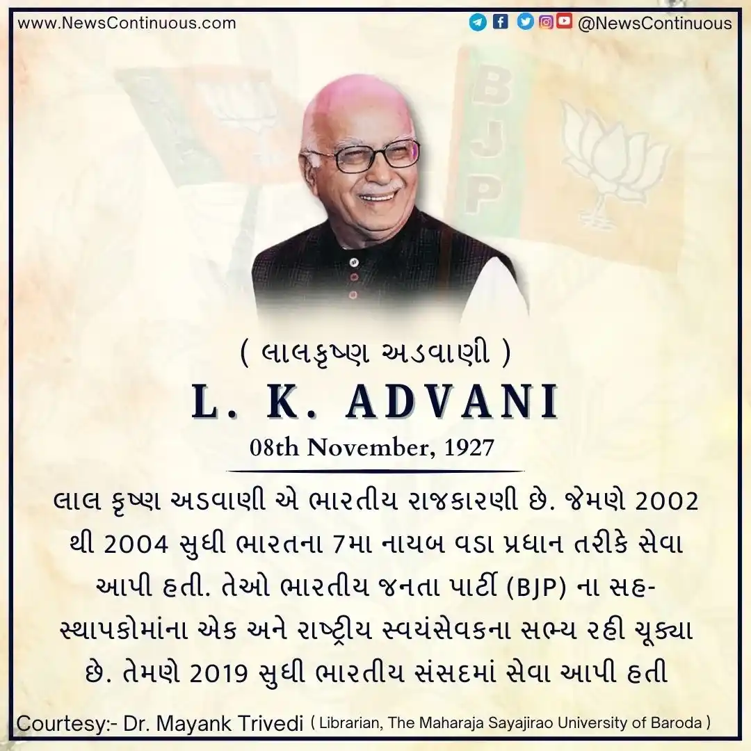 L. K. Advani :1927 માં આ દિવસે જન્મેલા, લાલ કૃષ્ણ અડવાણી એ ભારતીય રાજકારણી ( Indian politician ) છે. જેમણે 2002 થી 2004 સુધી ભારતના 7મા નાયબ વડા પ્રધાન તરીકે સેવા આપી હતી. તેઓ ભારતીય જનતા પાર્ટી (BJP) ના સહ-સ્થાપકોમાંના એક અને રાષ્ટ્રીય સ્વયંસેવકના સભ્ય રહી ચૂક્યા છે. તેમણે 2019 સુધી ભારતીય સંસદમાં સેવા આપી હતી અને એક મુખ્ય રાજકીય પક્ષ તરીકે ભાજપના ( BJP ) ઉદય માટે તેમને શ્રેય આપવામાં આવે છે. 2015માં તેમને ભારતના બીજા સર્વોચ્ચ નાગરિક સન્માન પદ્મ વિભૂષણથી નવાજવામાં આવ્યા હતા.