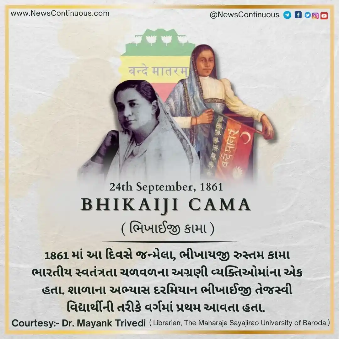 Bhikaiji Cama : 1861 માં આ દિવસે જન્મેલા, ભીખાયજી રુસ્તમ કામા ભારતીય સ્વતંત્રતા ચળવળના ( Indian independence movement ) અગ્રણી વ્યક્તિઓમાંના એક હતા. શાળાના અભ્યાસ દરમિયાન ભીખાઈજી તેજસ્વી વિદ્યાર્થીની તરીકે વર્ગમાં પ્રથમ આવતા હતા. નાની ઉમરથી જ દેશપ્રેમના બીજ તેના માનમાં રોપાઈ ચૂક્યા હતા. તેમણે વર્ષ 1907માં જર્મનીના સ્ટુટગાર્ડમાં ઇન્ટરનેશનલ સોશિયાલિસ્ટ કોંગ્રેસમાં ભારતનો ઝંડો ( Indian Flag ) ફરકાવ્યો હતો. ભીખાઈજી કામાના આ સાહસની ખૂબ જ પ્રશંસા કરવામાં આવી હતી. શ્યામજી કૃષ્ણ વર્મા અને કામા દ્વારા ડિઝાઇન કરવામાં આવેલા એ ભારતીય ઝંડાને હાલના ભારતીય તિરંગાની આધારશીલા તરીકે પણ જોવામાં આવે છે.