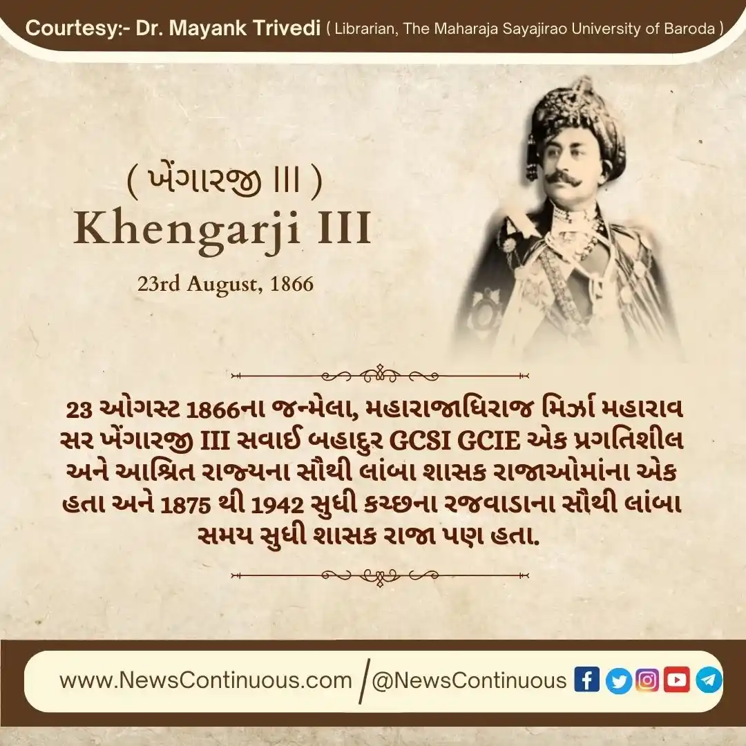 Khengarji III : 23 ઓગસ્ટ 1866ના જન્મેલા, મહારાજાધિરાજ મિર્ઝા મહારાવ સર ખેંગારજી III ( Maharajadhiraj Mirza Maharao Sir Khengarji III ) સવાઈ બહાદુર GCSI GCIE એક પ્રગતિશીલ અને આશ્રિત રાજ્યના સૌથી લાંબા શાસક રાજાઓમાંના એક હતા અને 1875 થી 1942 સુધી કચ્છના રજવાડાના સૌથી લાંબા સમય સુધી શાસક રાજા પણ હતા. 1892 માં, તેમના શાસનકાળ દરમિયાન, કચ્છને 17 બંદૂકોની સલામી આપવામાં આવી હતી.