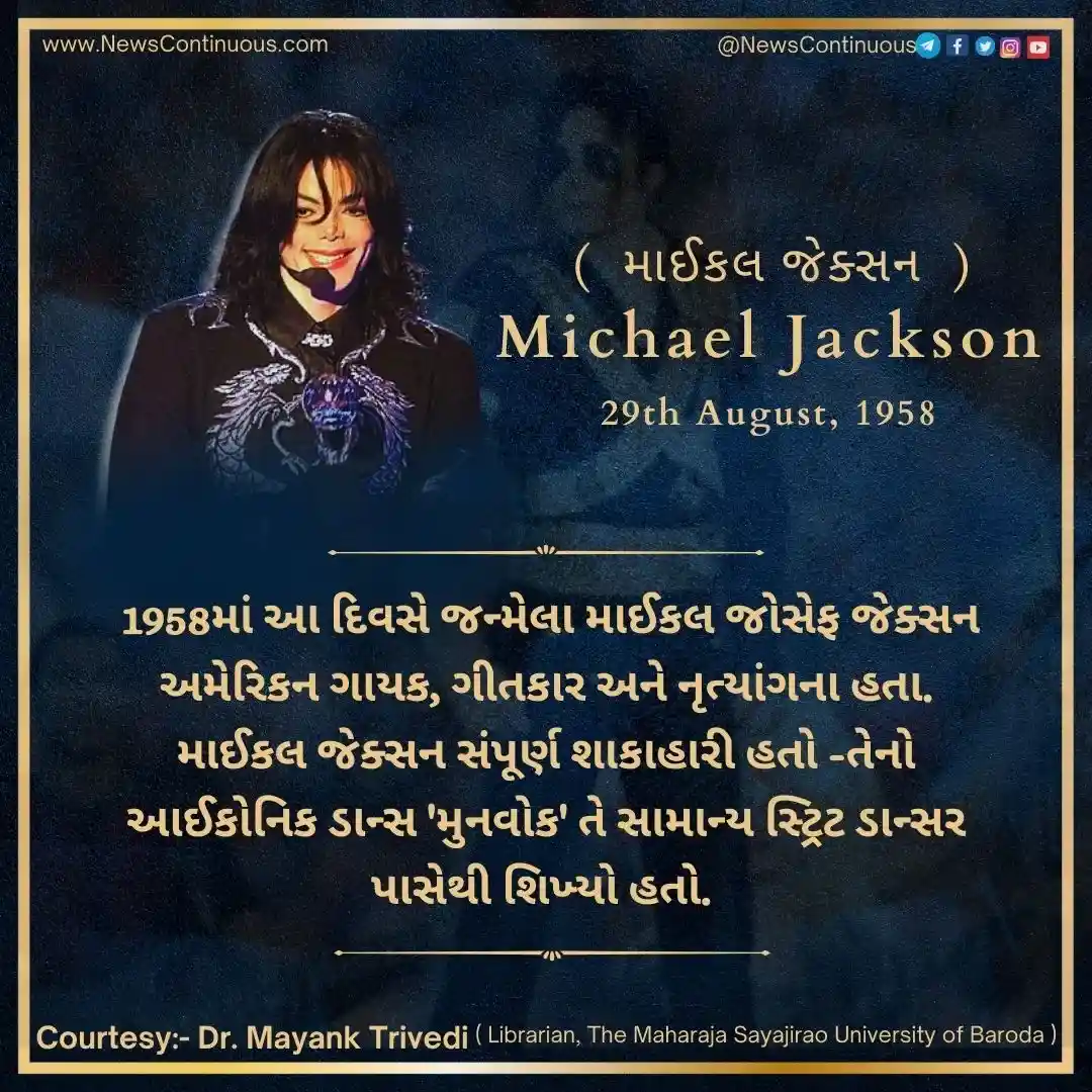 Michael Jackson : 1958માં આ દિવસે જન્મેલા માઈકલ જોસેફ જેક્સન અમેરિકન ગાયક ( American singer ) , ગીતકાર અને નૃત્યાંગના હતા. માઈકલ જેક્સન સંપૂર્ણ શાકાહારી હતો -તેનો આઈકોનિક ડાન્સ ‘મુનવોક’ ( Moonwalk ) તે સામાન્ય સ્ટ્રિટ ડાન્સર પાસેથી શિખ્યો હતો. કેટલાક મીડિયા અહેવાલો મુજબ તે 150 વર્ષથી વધુ જીવવા માગતા હતા, જેના માટે તેમણે પોતાના ઘરે 12 અંગત ડોક્ટરોની ટીમ રાખી હતી, જેઓ તેને દવાઓ અને યોગ્ય આહાર આપતા હતા. માઈકલના ( Michael Joseph Jackson ) ફૂડનું પણ પહેલાં પ્રયોગશાળામાં પરીક્ષણ કરવામાં આવતું હતું અને પછી તેઓ ખાતા હતા.