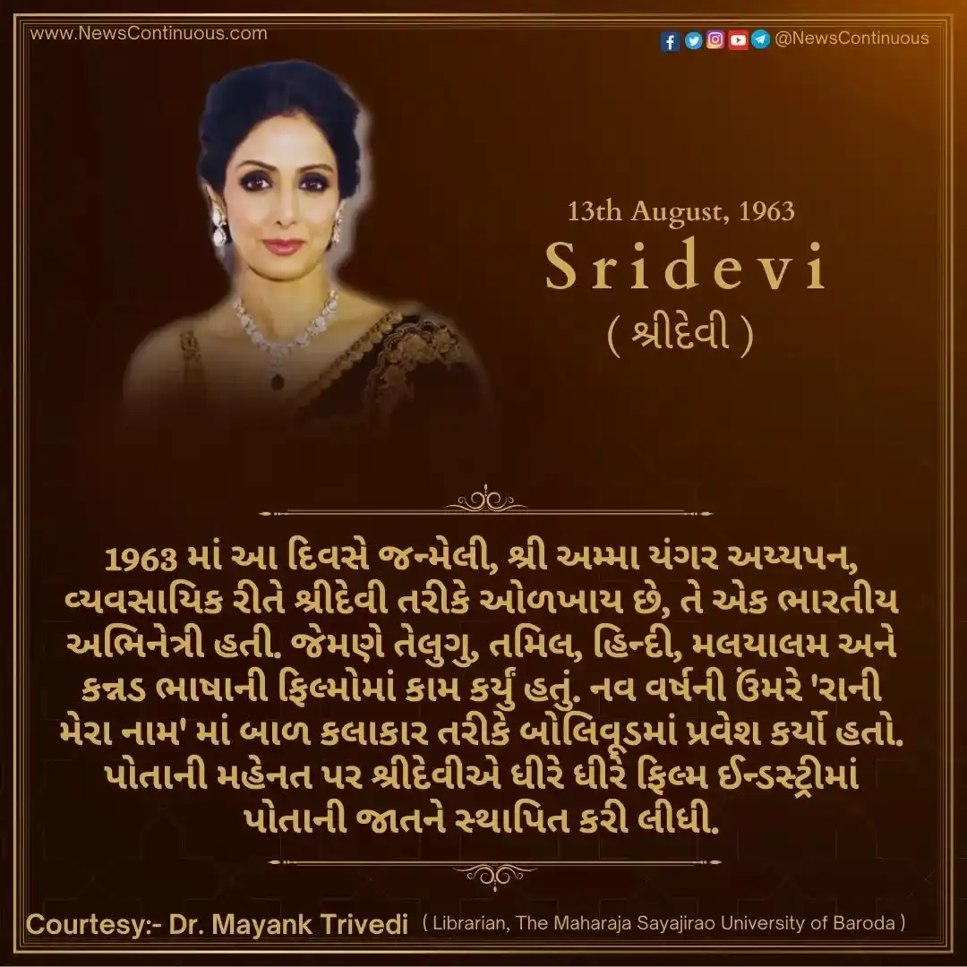 Sridevi: 1963 માં આ દિવસે જન્મેલી, શ્રી અમ્મા યંગર અય્યપન, વ્યવસાયિક રીતે શ્રીદેવી તરીકે ઓળખાય છે, તે એક ભારતીય અભિનેત્રી ( Indian actress ) હતી. જેમણે તેલુગુ, તમિલ, હિન્દી, મલયાલમ અને કન્નડ ભાષાની ફિલ્મોમાં કામ કર્યું હતું. નવ વર્ષની ઉંમરે ‘રાની મેરા નામ’ માં બાળ કલાકાર તરીકે બોલિવૂડમાં ( Bollywood actress ) પ્રવેશ કર્યો હતો. પોતાની મહેનત પર શ્રીદેવીએ ધીરે ધીરે ફિલ્મ ઈન્ડસ્ટ્રીમાં પોતાની જાતને સ્થાપિત કરી લીધી. 19 વર્ષની ઉંમરે, તેણે અમોલ પાલેકર સાથેની ફિલ્મ ‘સોલવા સાવન’ દ્વારા અભિનેત્રી તરીકે બોલિવૂડમાં પ્રવેશ કર્યો હતો. શ્રીદેવીને દેશના ચોથા સર્વોચ્ચ નાગરિક સન્માન પદ્મશ્રીથી નવાજવામાં આવ્યા હતા