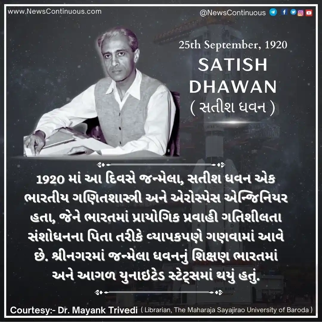 Satish Dhawan : 1920 માં આ દિવસે જન્મેલા, સતીશ ધવન એક ભારતીય ગણિતશાસ્ત્રી ( Indian Mathematician ) અને એરોસ્પેસ એન્જિનિયર ( Aerospace Engineer ) હતા, જેને ભારતમાં પ્રાયોગિક પ્રવાહી ગતિશીલતા સંશોધનના પિતા તરીકે વ્યાપકપણે ગણવામાં આવે છે. શ્રીનગરમાં જન્મેલા ધવનનું શિક્ષણ ભારતમાં અને આગળ યુનાઇટેડ સ્ટેટ્સમાં થયું હતું. ભારતમાં સ્પેસ સાયન્સની સ્થાપના કરવામાં તેમનું યોગદાન મોટું હતું.