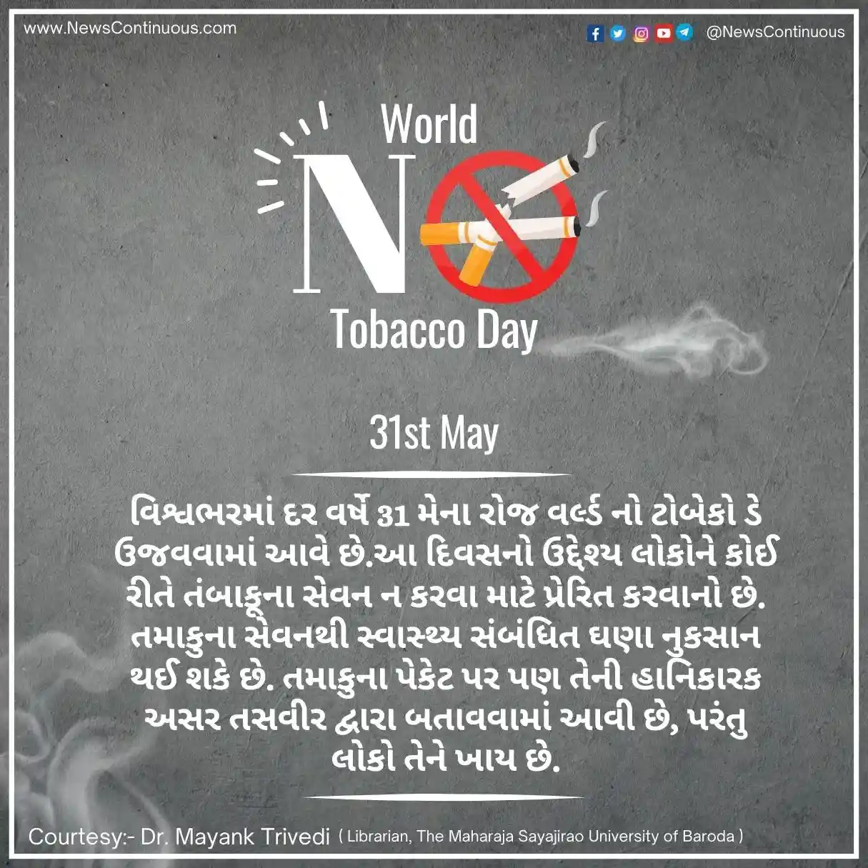 World No Tobacco Day :વિશ્વભરમાં દર વર્ષે 31 મેના રોજ વર્લ્ડ નો ટોબેકો ડે ઉજવવામાં આવે છે.આ દિવસનો ઉદ્દેશ્ય લોકોને કોઈ રીતે તંબાકૂના ( Tobacco ) સેવન ન કરવા માટે પ્રેરિત કરવાનો છે. તમાકુના સેવનથી સ્વાસ્થ્ય સંબંધિત ઘણા નુકસાન થઈ શકે છે. તમાકુના પેકેટ પર પણ તેની હાનિકારક અસર તસવીર દ્વારા બતાવવામાં આવી છે, પરંતુ લોકો તેને ખાય છે. વિશ્વ આરોગ્ય સંસ્થાએ 1987માં વિશ્વ તમાકુ નિષેધ દિવસની શરૂઆત કરી હતી. આ દિવસ પહેલીવાર 7 એપ્રિલ 1988ના રોજ ઉજવવામાં આવ્યો હતો. આ પછી, 31 મે 1988 ના રોજ WHO 42.19 ઠરાવ પસાર થયા પછી, આ દિવસ દર વર્ષે 31 મેના રોજ ઉજવવામાં આવ્યો.