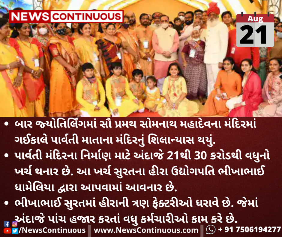 બાર જ્યોતિર્લિંગમાં સૌ પ્રમથ સોમનાથ મહાદેવના મંદિરમાં ગઈકાલે પાર્વતી માતાના મંદિરનું શિલાન્યાસ થયું.