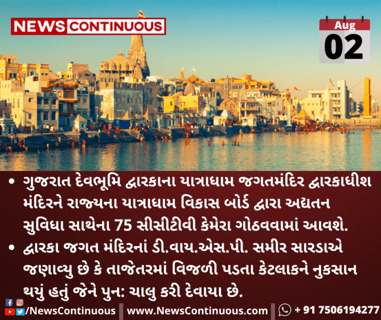 ગુજરાત દેવભૂમિ દ્વારકાના યાત્રાધામ જગતમંદિર દ્વારકાધીશ મંદિરને રાજ્યના યાત્રાધામ વિકાસ બોર્ડ દ્વારા અદ્યતન સુવિધા સાથેના 75 સીસીટીવી કેમેરા ગોઠવવામાં આવશે.