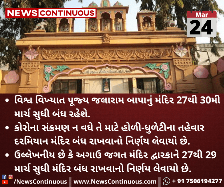 વિશ્વ વિખ્યાત પૂજ્ય જલારામ બાપાનું મંદિર 27થી 30મી માર્ચ સુધી બંધ રહેશે.