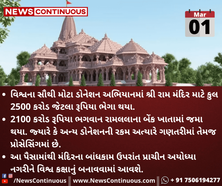 2100 કરોડ રૂપિયા ભગવાન રામલલાના બેંક ખાતામાં જમા થયા. જ્યારે કે અન્ય ડોનેશનની રકમ અત્યારે ગણતરીમાં તેમજ પ્રોસેસિંગમાં છે.