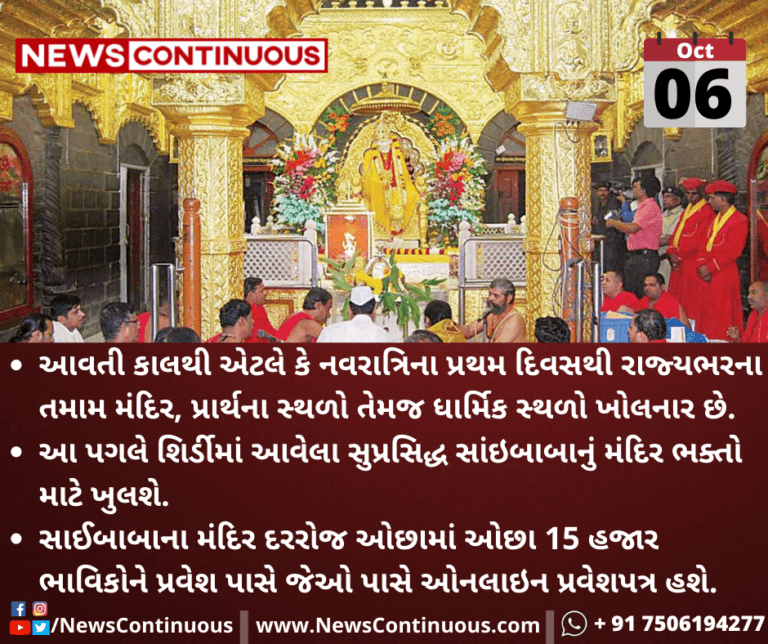 આવતીકાલથી એટલે કે નવરાત્રિના પ્રથમ દિવસથી રાજ્યભરના તમામ મંદિર, પ્રાર્થના સ્થળો તેમજ ધાર્મિક સ્થળો ખોલનાર છે.