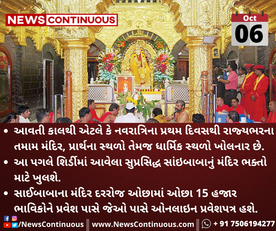 આ પગલે શિર્ડી માં આવેલા સુપ્રસિદ્ધ સાંઇબાબાનું મંદિર ભક્તો માટે ખુલશે.