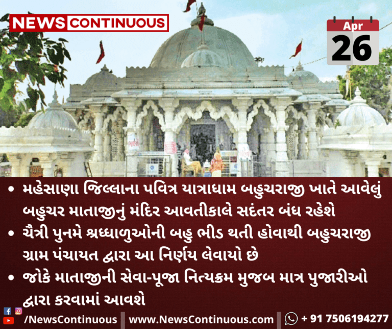 મહેસાણા જિલ્લાના પવિત્ર યાત્રાધામ બહુચરાજી ખાતે આવેલું બહુચર માતાજીનું મંદિર આવતીકાલે સદંતર બંધ રહેશે
