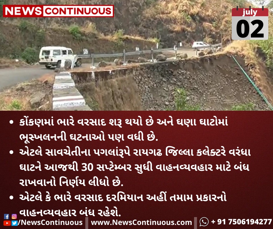 એટલે સાવચેતીના પગલાંરૂપે રાયગઢ(Raigarh) જિલ્લા કલેક્ટરે(District Collector) વરંધા ઘાટને(varandha ghat) આજથી 30 સપ્ટેમ્બર સુધી વાહનવ્યવહાર(Transportation) માટે બંધ રાખવાનો નિર્ણય લીધો છે.