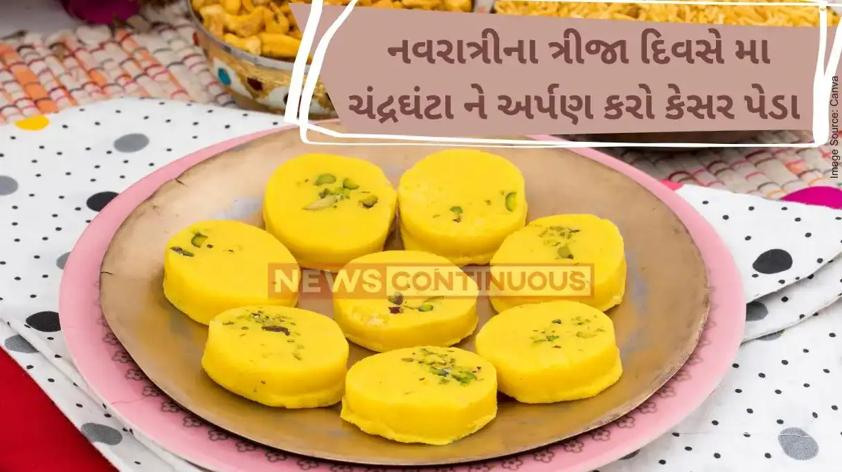 Kesar Peda :ચૈત્રી નવરાત્રીનો પવિત્ર તહેવાર ચાલી રહ્યો છે. આજે નવરાત્રિના ત્રીજા દિવસે, દેવી દુર્ગાના ત્રીજા સ્વરૂપ માં ચંદ્રઘંટાની પૂજા કરવામાં આવે છે. એવું માનવામાં આવે છે કે મા દુર્ગાનું આ સ્વરૂપ અત્યંત શાંતિપૂર્ણ અને કલ્યાણકારી છે. જો આપણે મા ચંદ્રઘંટા ના પ્રિય ભોજન વિશે વાત કરીએ તો મા ચંદ્રઘંટાને દૂધ અને દૂધમાંથી બનેલી વાનગીઓ ખૂબ જ પસંદ છે. આ જ કારણ છે કે માતાના ભક્તો તેમના સ્વરૂપને પ્રસન્ન કરવા માટે દૂધમાંથી બનેલી વસ્તુઓ પ્રસાદ તરીકે ચઢાવે છે. જો તમે પણ માતા ચંદ્રઘંટાનો આશીર્વાદ તમારા ઘરમાં રાખવા માંગતા હોવ તો તેમના પ્રસાદના ભાગરૂપે કેસર પેડા ચઢાવો. ચાલો જાણીએ કેસર પેડા ભોગ બનાવવાની રેસિપી.