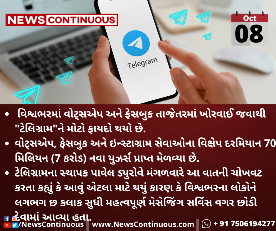 વિશ્વભરમાં વોટ્સએપ અને ફેસબુક તાજેતરમાં ખોરવાઈ જવાથી "ટેલિગ્રામ"ને મોટો ફાયદો થયો છે.