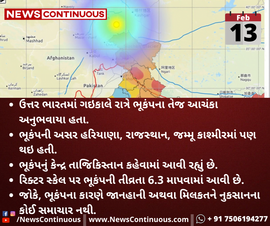 ઉત્તર ભારતમાં ગઇકાલે રાત્રે ભૂકંપના તેજ આચંકા અનુભવાયા હતા. ભૂકંપની અસર હરિયાણા, રાજસ્થાન, જમ્મૂ કાશ્મીરમાં પણ થઇ હતી. ભૂકંપનું કેન્દ્ર તજાકિસ્તાન કહેવામાં આવી રહ્યું છે.