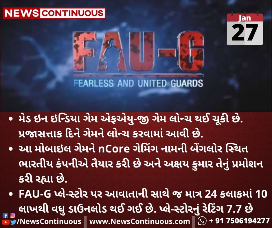 FAU-G પ્લે-સ્ટોર પર આવાતાની સાથે જ માત્ર 24 કલાકમાં 10 લાખથી વધુ ડાઉનલોડ થઈ ગઈ છે. પ્લે-સ્ટોરનું રેટિંગ 7.7 છે