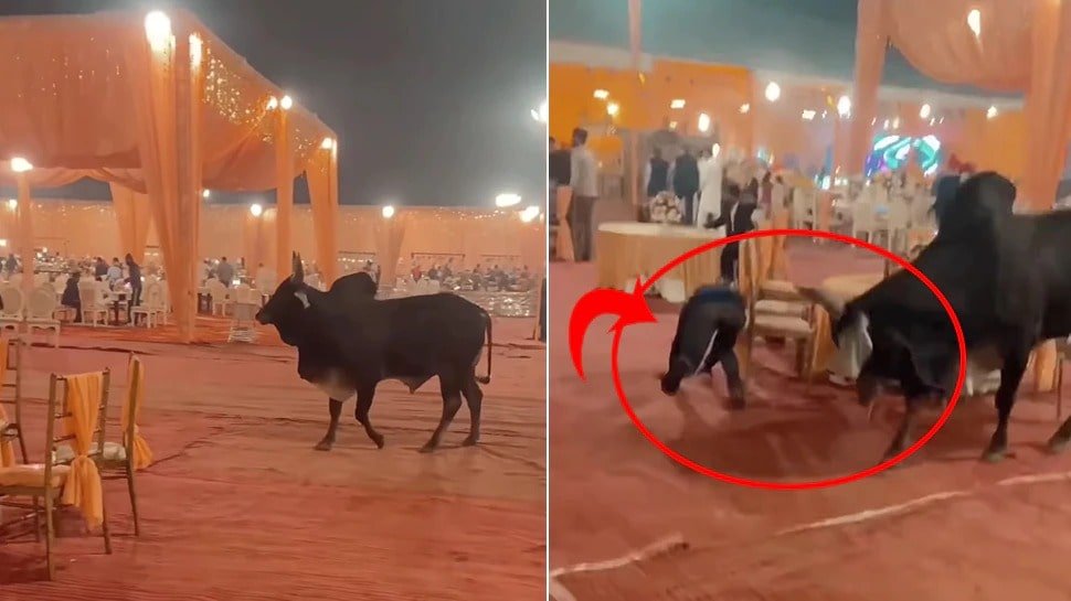 સોશિયલ મીડિયા પર વાયરલ થઈ રહેલા વીડિયોમાં જોઈ શકાય છે કે અચાનક એક બળદ લગ્નમાં ઘુસી ગયો અને પછી અહી-ત્યાં ભટકવા લાગ્યો. તે ફૂડ સ્ટોલ પાસે કંઈક ખાવાના ઈરાદે ઘૂમી રહ્યો હતો અને તેની આસપાસ કેટલાક લોકોને જોતા જ તેણે હોર્ન વડે હુમલો કરવાનું શરૂ કરી દીધું હતું. આ દરમિયાન ત્યાં હાજર એક મહેમાન પણ ભાગવાનો પ્રયાસ કરે છે અને તે જમીન પર પડી જાય છે. લગ્નના પંડાલની અંદરથી કોઈએ વીડિયો બનાવીને ઈન્સ્ટાગ્રામ પર અપલોડ કરી દીધો અને આ વીડિયો હવે ઘણો વાયરલ થઈ રહ્યો છે. આમાં બળદ પણ ફૂડ સ્ટોલ પાસે જતો જોવા મળે છે.