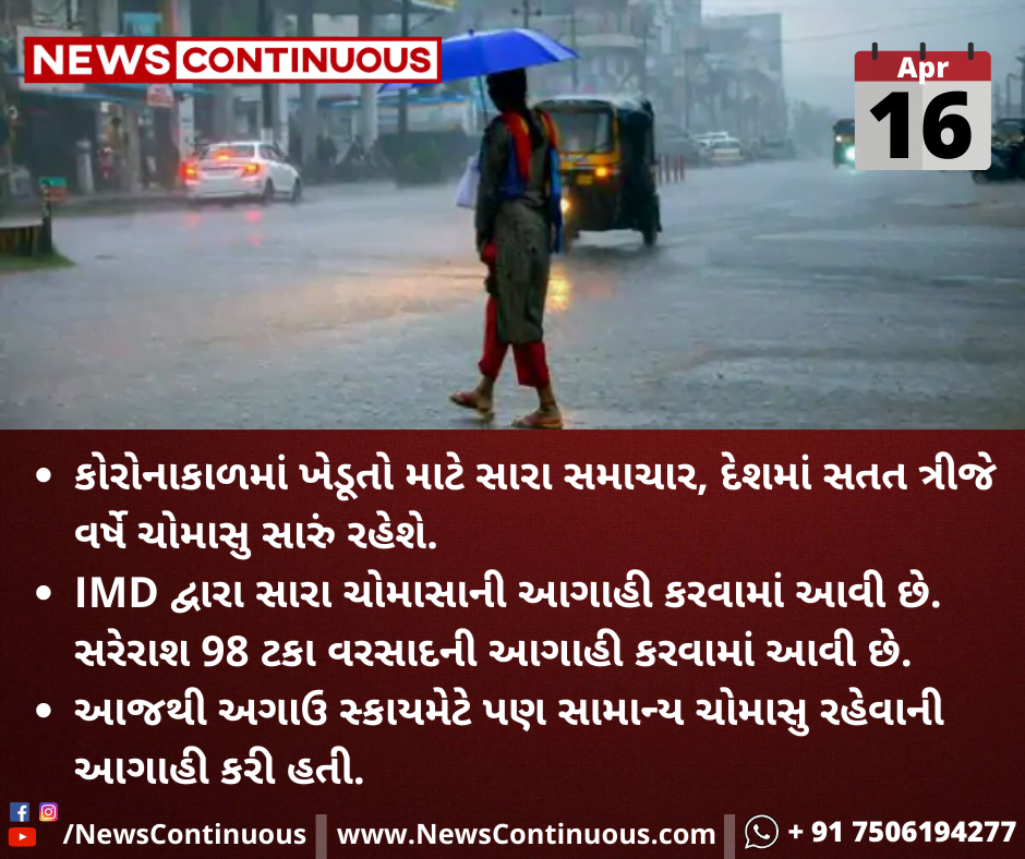 કોરોનાકાળમાં ખેડૂતો માટે સારા સમાચાર, દેશમાં સતત ત્રીજે વર્ષે ચોમાસુ સારું રહેશે