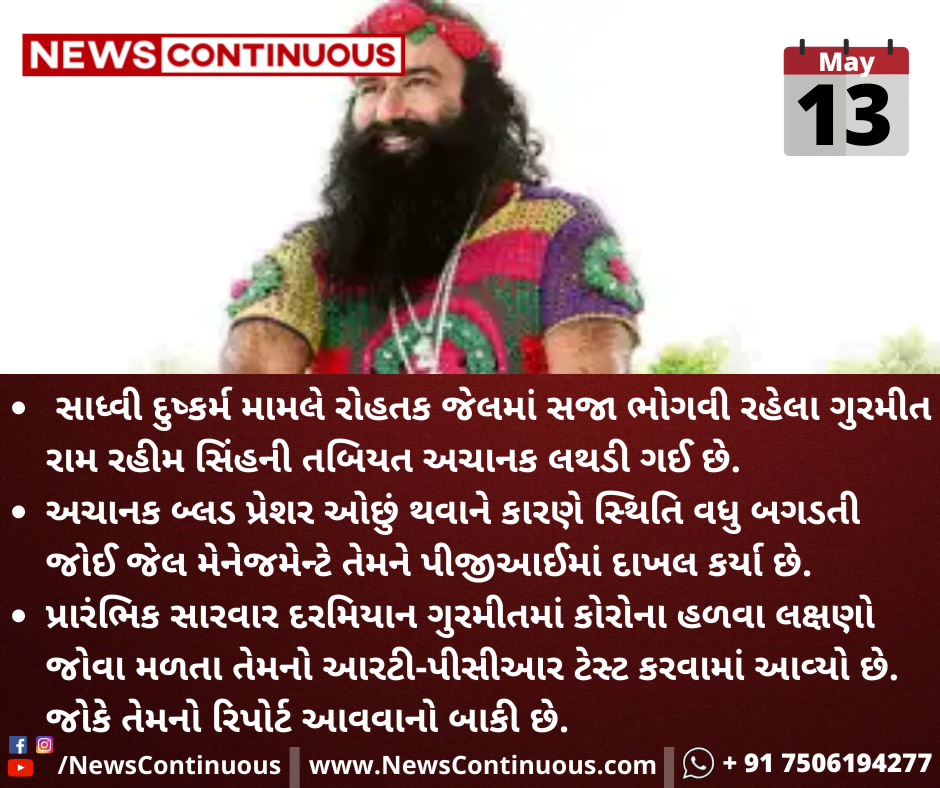 સાધ્વી દુષ્કર્મ મામલે રોહતક જેલમાં સજા ભોગવી રહેલા ગુરમીત રામ રહીમ સિંહની તબિયત અચાનક લથડી ગઈ છે.