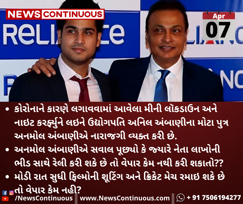 કોરોનાને કારણે લગાવવામાં આવેલા મીની લૉકડાઉન અને નાઇટ કરર્ફ્યુને લઇને ઉદ્યોગપતિ અનિલ અંબાણીના મોટા પુત્ર અનમોલ અંબાણીએ નારાજગી વ્યક્ત કરી છે.
