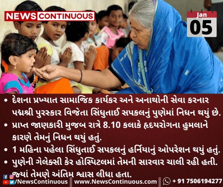 દેશના પ્રખ્યાત સામાજિક કાર્યકર અને અનાથોની સેવા કરનાર પદ્મશ્રી પુરસ્કાર વિજેતા સિંધુતાઈ સપકલનું પુણેમાં નિધન થયું છે.