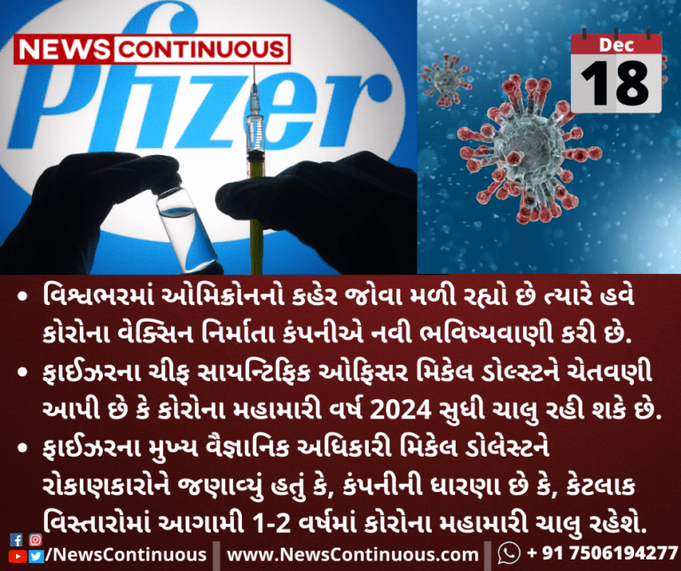 ફાઈઝરના મુખ્ય વૈજ્ઞાનિક અધિકારી મિકેલ ડોલેસ્ટને રોકાણકારોને જણાવ્યું હતું કે, કંપનીની ધારણા છે કે, કેટલાક વિસ્તારોમાં આગામી 1-2 વર્ષમાં કોરોના મહામારી ચાલુ રહેશે.