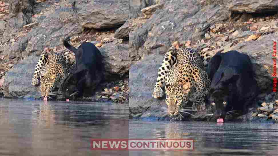 Leopard and Black Panther viral video વન્યજીવ પ્રેમીઓ માટે એક ખૂબ જ રોમાંચક સમાચાર સામે આવ્યા છે. સામાન્ય રીતે એકલા રહેવા ટેવાયેલા અને અત્યંત સતર્ક દીપડાનો એક દુર્લભ વીડિયો વાયરલ થઈ રહ્યો છે, જેમાં તે પોતાની જ પ્રજાતિના ‘બ્લેક પેન્થર’ સાથે જંગલના એક શાંત જળસ્ત્રોત પર પાણી પીતો જોવા મળી રહ્યો છે. આ દ્રશ્ય માત્ર મનમોહક જ નથી, પણ જંગલના કુદરતી સંતુલનનો સંકેત પણ આપે છે.વાયરલ વીડિયોમાં જોઈ શકાય છે કે એક સામાન્ય ટપકાંવાળો દીપડો પહેલાથી જ ખડક પર બેસીને પાણી પી રહ્યો છે. ત્યારે જ ત્યાં એક શાનદાર બ્લેક પેન્થરની એન્ટ્રી થાય છે. તે કોઈ પણ જાતના ડર કે ખચકાટ વગર દીપડાની બરાબર બાજુમાં બેસી જાય છે અને બંને શાંતિથી પાણી પીવા લાગે છે.