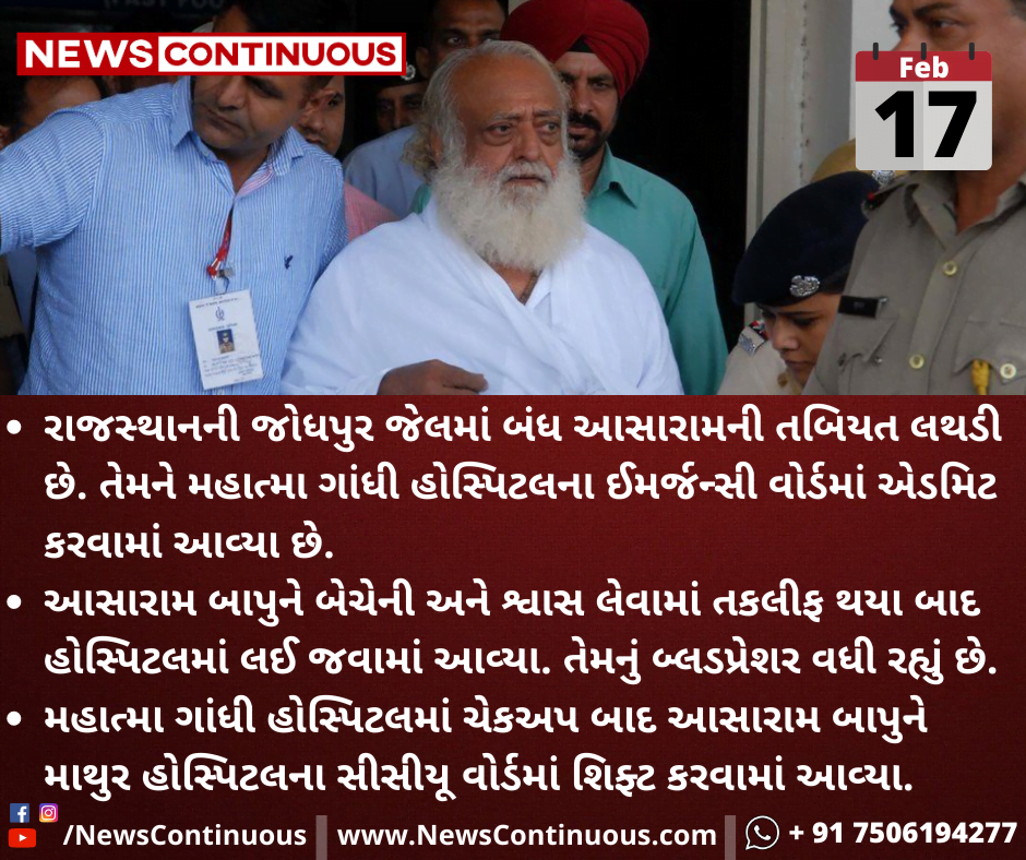 આસારામ બાપુને બેચેની અને શ્વાસ લેવામાં તકલીફ થયા બાદ હોસ્પિટલમાં લઈ જવામાં આવ્યા. તેમનું બ્લડપ્રેશર વધી રહ્યું છે.