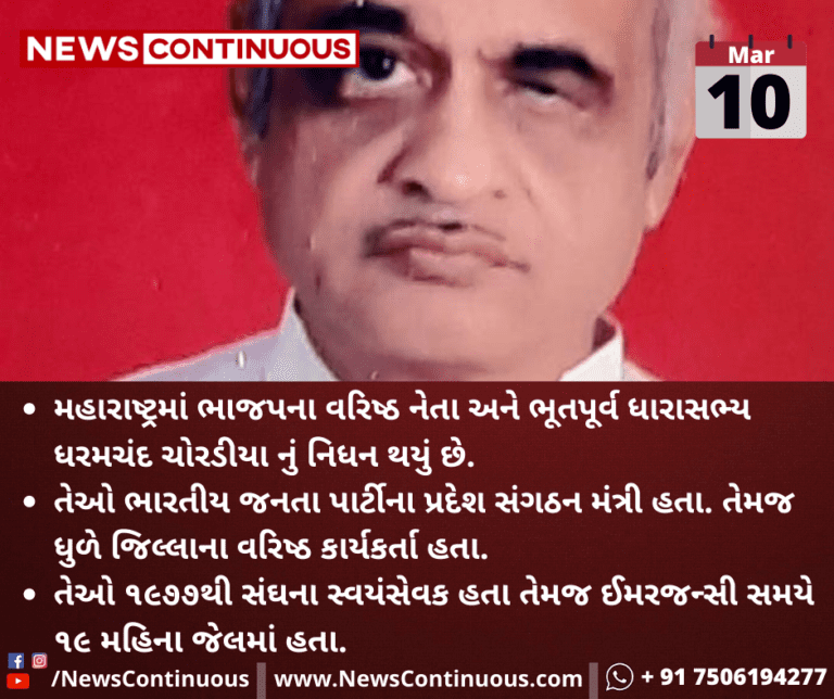મહારાષ્ટ્રમાં ભાજપના વરિષ્ઠ નેતા અને ભૂતપૂર્વ ધારાસભ્ય ધરમચંદ ચોરડીયા નું નિધન થયું છે.