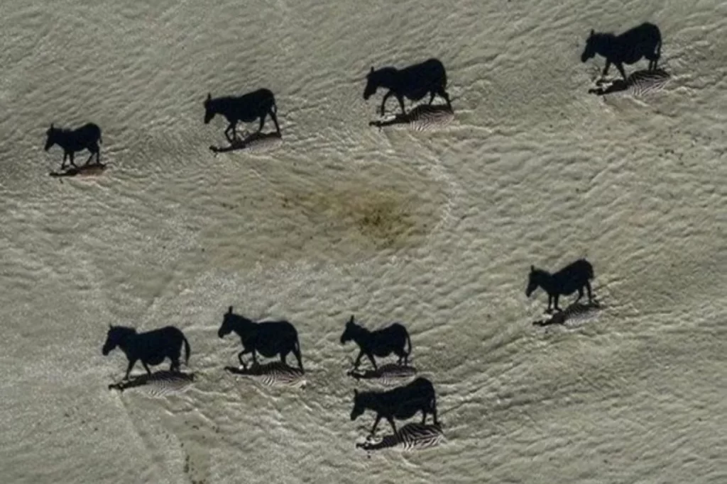 ફોટામાં ઘોડા જેવા કાળા રંગના પ્રાણીઓ ચાલતા જોવા મળે છે. પરંતુ તેઓ ઘોડા નથી. ફોટોની સુંદરતા એ છે કે જ્યારે તમે તેને ઝૂમ કરીને જોશો તો તમને ખબર પડશે કે તેમાં ઘણા ઝેબ્રા છે, જે ખૂબ ધ્યાનથી જોયા પછી જ દેખાય છે. આ ફોટોના કેપ્શનમાં લખ્યું છે કે ઝેબ્રા છીછરા પાણીમાં ચાલી રહ્યા છે અને સૂર્યપ્રકાશને કારણે તેનો પડછાયો તેના પર પડી રહ્યો છે, જેનાથી એવું લાગે છે કે પડછાયો ખરેખર કોઈ પ્રાણી છે.