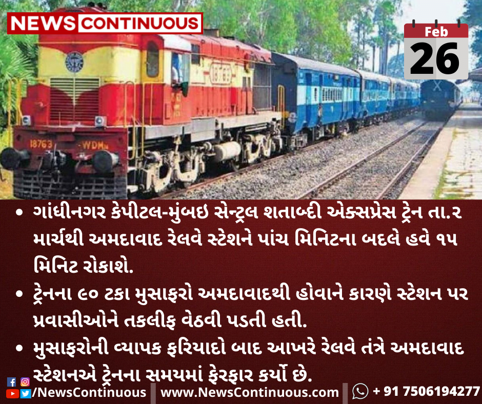 ગાંધીનગર કેપીટલ-મુંબઇ સેન્ટ્રલ શતાબ્દી એક્સપ્રેસ ટ્રેન તા.૨ માર્ચથી અમદાવાદ રેલવે સ્ટેશને પાંચ મિનિટના બદલે હવે ૧૫ મિનિટ રોકાશે.