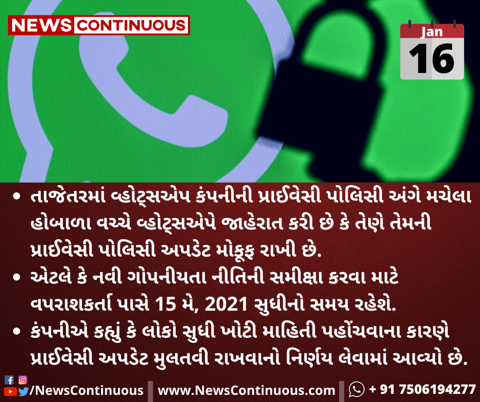 તાજેતરમાં વ્હોટ્સએપ કંપનીની પ્રાઈવેસી પોલિસી અંગે મચેલા હોબાળા વચ્ચે વ્હોટ્સએપે જાહેરાત કરી છે કે તેણે તેમની પ્રાઈવેસી પોલિસી અપડેટ મોકૂફ રાખી છે.