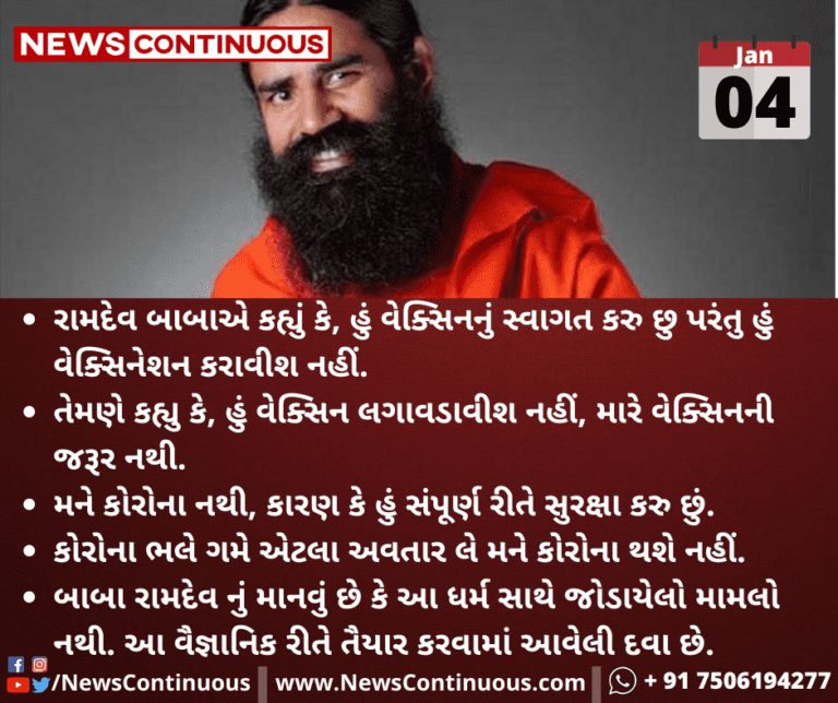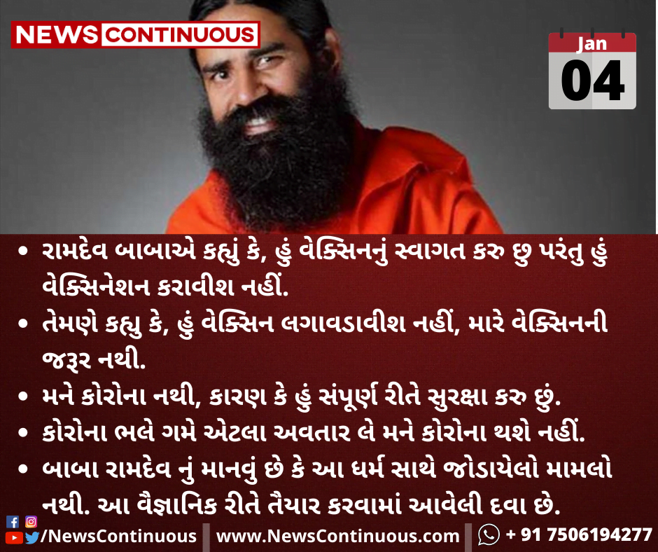રામદેવ બાબાએ કહ્યું કે, હું વેક્સિનનું સ્વાગત કરુ છુ પરંતુ હું વેક્સિનેશન કરાવીશ નહીં.